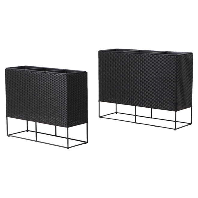 Display your plants and flowers in style with this Shanghai planter pot set. The planter is made with a powder-coated steel frame for rust resistance and durability for lasting outdoor use. The resin wicker covering is designed to stand up to the elements and gives the planters an elegant look that complements any décor setting. Each planter features 3 inner plastic dividers that accommodate a range of different flowers and plants. The set includes a large planter pot and a medium planter pot.
