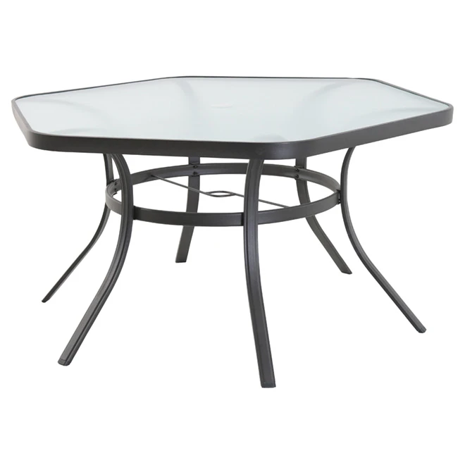 This hexagonal dinner table from Style Selections is the perfect addition to your deck. Its black steel frame and Mistlite frosted glass immediately give a contemporary look to any exterior décor while being very durable and weather resistant. This table is backed by a 1-year limited warranty.