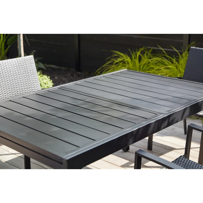 This extendable dining table from Style Selections will be the centrepiece of your patio. This black slatted table will add a rustic yet modern touch to your outdoor decor. For the perfect outdoor space, consider pairing it with other pieces from the Pelham Bay collection. Its sturdy steel frame will last for years. It provides enough space for 4 people and for 6 people when expanded.