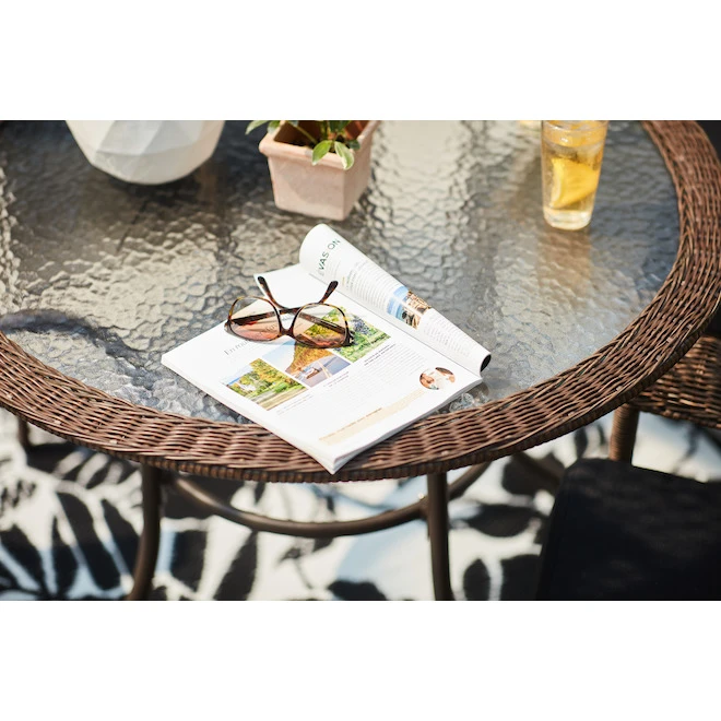 The classic style of this Spruce Hills patio dining table is sure to complement the look of your outdoor decor. Its durable steel frame is covered in a weather-resistant wicker material, and it comes with everything you’ll need to assemble it. Pair this glass top, round table with your existing patio furniture or purchase matching Spruce Hills patio chairs (sold separately) for a coordinated look. This product is backed by a 1-year limited warranty.